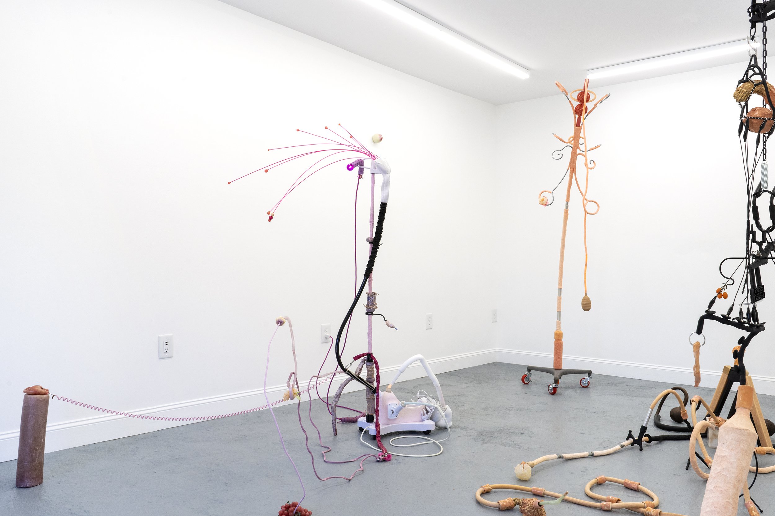 Stone House Art Gallery is pleased to present Low Hanging Fruit, a solo exhibition of new sculptures by Danni O’Brien. In this entirely three dimensional showcase, O’Brien reassembles formally functional tools and objects to provide new explorations about queer survivalism in a post dystopian society. Delicately balanced figures are composed of scavenged remnants from unknown origins and combined with membranous paper pulp in these playfully absurd new works. The literally and metaphorically “low” hanging fruit grapples with vulnerability and resistance in a conspicuously accessible throw-away culture. Through their spatial defiance, these works invoke an optimistic proclivity towards the future of queerness in an interdependent society.
